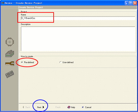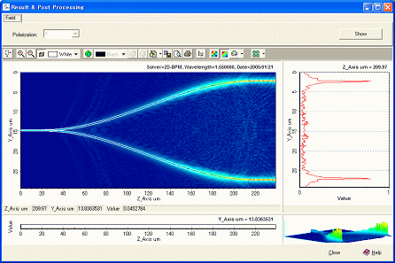 | ここでは、導波路の伝搬解析について記す。 伝搬解析をするデバイスとしてY分岐(正余弦型)を取り上げる。伝搬解析はAPSSのデバイスモジュールで行なう。そのためには、デバイスモジュールより下位の階層である導波路の解析(モード解析)が終了していなければならない。ここでは、先の導波路の項目でのFAQで用いたSOI導波路(導波路全体でも、対称性を利用した半分の解析でもどちらでも結構)を用いることとする。 よく使うデバイス構造に対しては「ユーザ マニュアル16章 あらかじめ定義されている構造」の中から選択すると簡単である。設計の制約からユーザ独自に「ユーザ定義」の形状も扱えるので柔軟にデバイス構造に対応できる。ここでは、簡単のために、あらかじめ定義されている構造を用いることとする。 APSSを起動し、ユーザ(とパスワード)を入れると、図1のウインドウが開く。 ![]() 図1.ウインドウが開いた初期状態 ここで、図2に示すように、File→New Project→Deviceを選択すると図3が開く。 ![]() 図2.デバイスプロジェクト作成の最初のステップ ![]() 図3.デバイスプロジェクト作成画面 図3では、プロジェクト名(赤四角)に名前を登録する。導波路ではわかり易くW_のように名前を付けたので、それに習って、ここではD_YBranchCosとした。その下のDescription欄にはこのプロジェクトについてのメモを残すことができる。APSSは日本語をサポートしていないのでアルファベットや数字を使用されたい。勿論、何も書かないで空白のままでも良い。ラジオ ボタンで選択可能なHow to createの箇所は、今回、「あらかじめ定義された構造」を使うので、Pre-defined (赤丸)を選択する。全ての選択が終わったら、Next(青丸)をクリックすると、ウイザードは、図4へ進む。 ![]() 図4.デバイスプロジェクトで使用する導波路構造選択画面 図4の画面では、デバイスプロジェクトで使用する導波路構造を選択する。図のようにマウスで選択すると、選択された導波路プロジェクトが黒くなる。そして、Next(赤丸)をクリックする。ウイザードは図5へと導く。 ![]() 図5.あらかじめ定義されたデバイスの選択画面 図5はあらかじめ定義されたデバイス構造の選択画面である。デバイスタイプ(赤四角)から、分類としてY-Junctionを選択する。すると、その右の画面にY分岐の絵が現れる。次にNext(青丸)をクリックすると図6が現れる。 ![]() 図6.さまざまなY-junction構造選択メニュー ラジオ ボタンで希望の構造を選択する。今回は、Cosine branch(余弦型)[赤丸]を選択した。全ての選択が終了すると、Next(青丸)クリックすると図7が開く。 ![]() 図7.ウイザード最終のデバイス エディタ画面 図7ではライブラリでシンボリック表現(変数などで定義されたもの)された構造に実際の寸法を与える過程である。変数の意味が良くわからないときには、Structure/Picture(赤丸)をクリックすると、図7のように変数定義画面となる。この赤丸はトグル スイッチとなっていて、図7でそのシンボルをクリックすると図8となる。図7または8で各変数の実際の寸法を与える。今回は分岐の長さL=200μm、2つの分岐間隔H2+H3=25μm (H2=H3)とした。これらの値は後で修正も可能である。定義が終わると、図7のFinish(青丸)をクリックしてウイザードを終了し、図9となる。 ![]() 図8.ライブラリの定義図に切り替えた状態 ![]() 図9.ウイザードが終了した段階の画面 図9でProportional View(青丸)をクリックすると縦横の縮尺を同一の表示となる。図9ではRun Simulation(赤丸)が有効になっているので、これをクリックする。図10のデバイス解析設定画面が開く。 ![]() 図10.デバイス解析設定画面 ここで解析しようとするSOI導波路はTEモード用に設計された構造であるので、図10では、Y偏波(赤丸)を選択する。その後、タブを”Solver Selection”(解法選択)[青丸]に切り替える。 ![]() 図11.解法設定画面 図11では端子特性としてSパラメータを求めるか、単にフィールドの計算を行なうかの選択が最初のOutput Selectionとして求められる。この例では、フィールド計算を行なうことにする。反射領域が定義されていれば右のチェックボックスにチェックを入れる。このとき、定義されている反射領域はFDTD法で計算される。即ち、BPMとFDTD法をミックスしてデバイス解析を行なうことになる。Solver Dimensionは2次元解析か3次元解析かの選択を行なう。導波路断面の定義などが正常でないとき(例えば、導波路で定義した導波路幅とデバイス解析で用いる導波路幅の定義が異なるときなど)では3次元解析ボタンが有効にはならなく、2次元解析のみが許される。Dynamic Showingにチェックをいれると計算途中のフィールドを表示する。計算機資産は少し無駄遣いとなるが、長い計算では計算の進捗をモニターすることができ、ユーザにとっては安心となる。図10の画面選択が終わると、”Advanced Setting”(赤丸)を選択する。 ![]() 図12.BPMソルバーのパラメータ設定画面 図12はBPM解析のときのパラメータ設定画面である。 Algorithm Parametersとして、Scheme Factorはおおよそ0.5、解