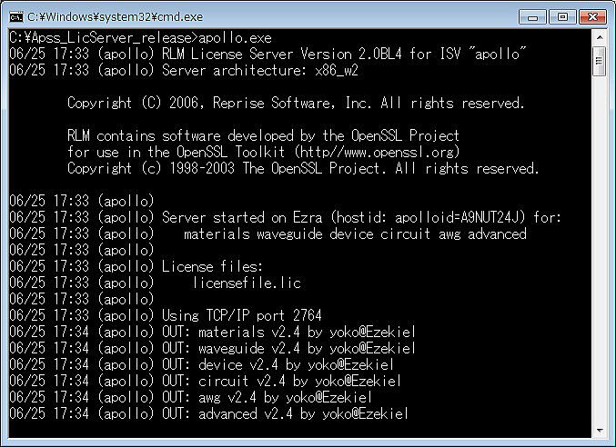5.ネットワークライセンスのインストール(登録Server側) ApssLicServer_releaseのフォルダーのApssLicServer.exeを実行する。 ![]() 上図で”Install License Service"をクリックすると、下のコマンドプロンプト画面が瞬時に現れて消える。 ![]() 消えた後には、 ![]() は表示されて、正常にインストールが終了したことがわかる。 Uninstallでは、"Uninstall License Service"をクリックする。正常に終わるとメッセージが表示される。 6.Serverの再起動(Run Standalone Serverボタンをクリックする) 下のコマンドプロンプト画面が現れる。(Server名はErza,サーバーに装着したUSBキー番号はA9NUT24Jである。) ![]() この動作で、Server側のネットワークライセンスが有効となる。 7.Client側からスタート→プログラム→Apollo Photonics→APSS 2.4→APSSを実行 下のようにプログラムが起動します。 。この時、先に示したServer側でのコマンドプロンプト画面には、Clientとの通信が正常であることが表示される。 ![]() 以上 (2010年6月25改訂) |
